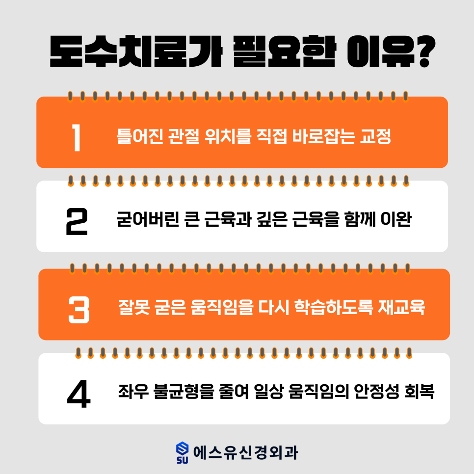 척추측만증 치료를 고민하고 있다면 통증만 바라보지 말고 몸 전체 정렬을 함께 살펴보세요. 그리고 구조를 직접 다루는 도수치료를 통해 무너진 균형을 다시 제자리로 돌려놓는 과정이 꼭 필요합니다. 지금까지 여러분의 척추 건강을 지키는 수원척추측만증 에스유신경외과였습니다.