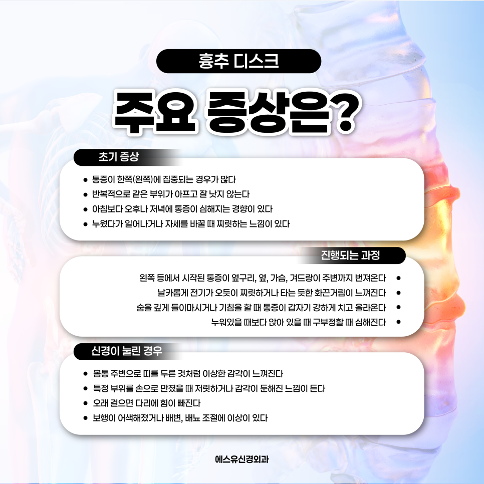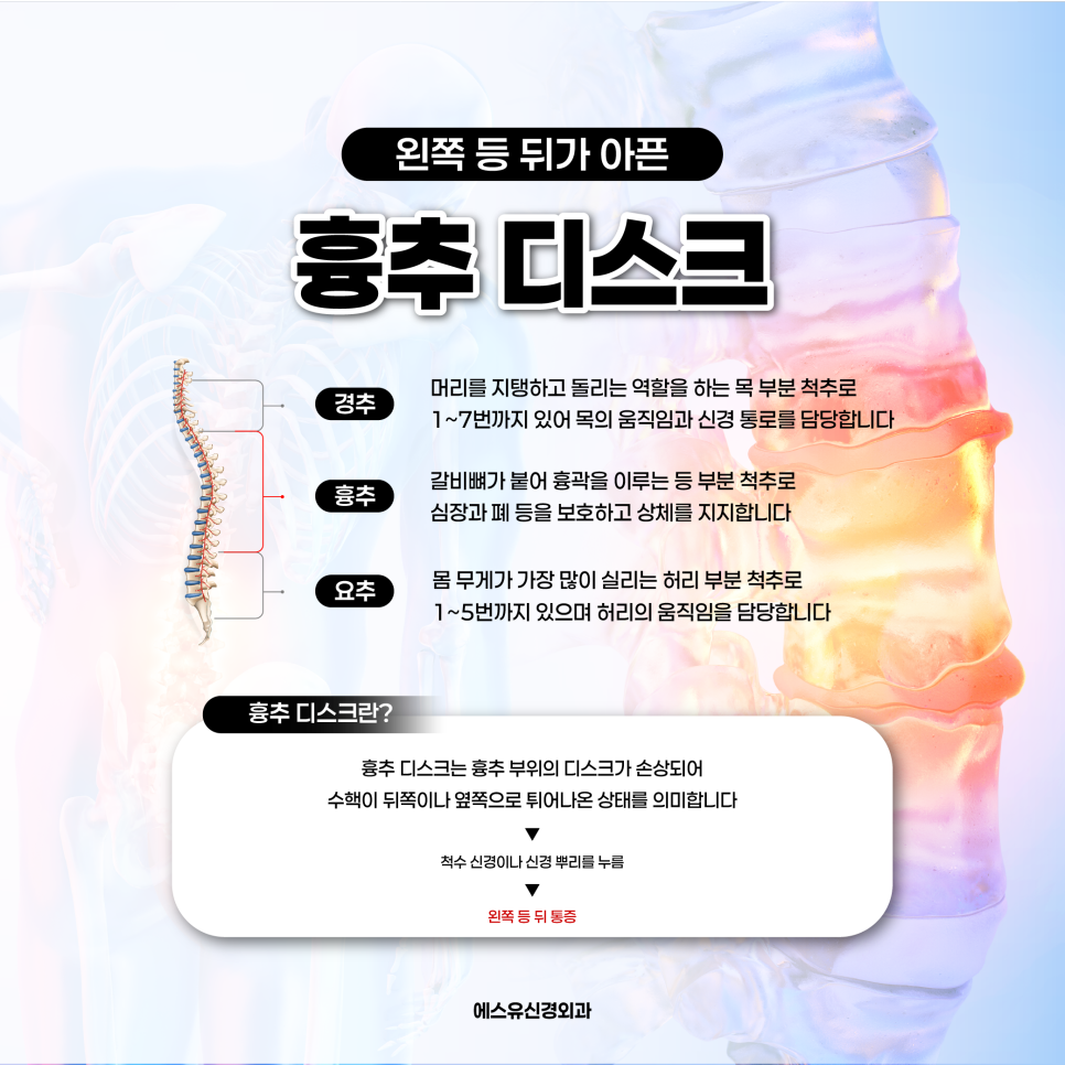 등과 옆구리가 함께 불편해지는 통증은 하루 이틀 무리해서 생기는 경우보다 몸 중심부 구조에 부담이 누적되며 나타나는 경우가 많습니다. 특히 같은 부위가 반복적으로 아프거나 시간이 지나도 시원하게 풀리지 않는다면 흉추디스크처럼 등 중간 구간의 문제를 의심해볼 수 있습니다.
