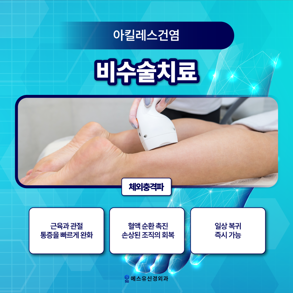 체외충격파는 통증 부위에 일정한 에너지를 전달해 조직 회복을 촉진하는 치료입니다. 쉽게 말해 손상된 부위에 자극을 주어 회복 반응을 끌어올리는 방식입니다. 절개가 필요 없고 치료 시간도 비교적 짧습니다. 시술 후 바로 일상생활이 가능하다는 점도 장점으로 꼽힙니다. 특히 만성 아킬레스건염에서 좋은 반응을 보이는 경우가 많습니다.