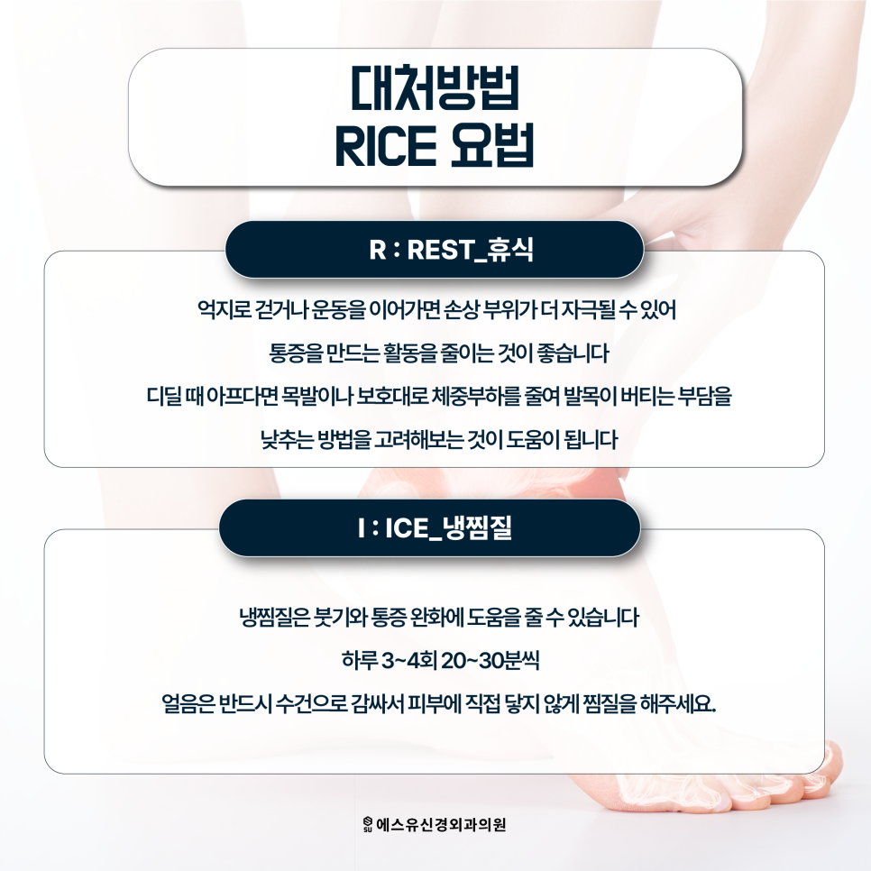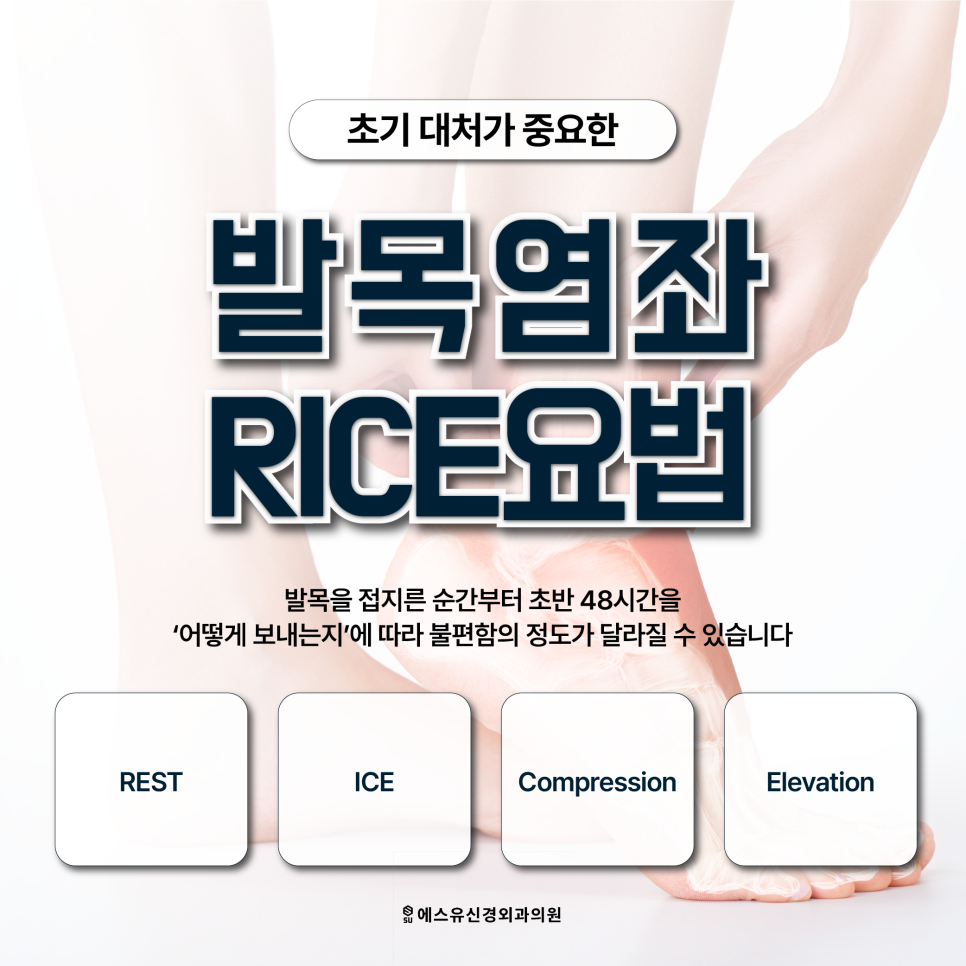 RICE요법은 가장 기본이지만 가장 중요한 초기 대응입니다. 여기에 적절한 치료와 재활이 더해진다면 회복 속도는 훨씬 빨라질 수 있습니다. 발목염좌통증이 반복되거나 쉽게 낫지 않는다면 혼자 고민하지 마시고 정확한 평가를 받아보시길 권해드립니다. 에스유신경외과는 발목염좌 환자분들의 상태에 맞춘 단계별 치료 계획을 통해 빠른 일상 복귀를 돕고 있습니다. 발목을 가볍게 여기지 마세요. 처음이 가장 중요합니다.