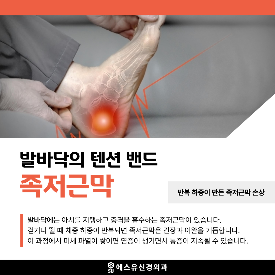 발바닥에는 족저근막이라는 두꺼운 섬유성 조직이 존재합니다. 이 구조물은 뒤꿈치 뼈인 종골에서 시작해 발가락 방향으로 부채꼴처럼 퍼져 있으며 발의 아치를 유지하고 보행 시 충격을 흡수하는 역할을 합니다.
