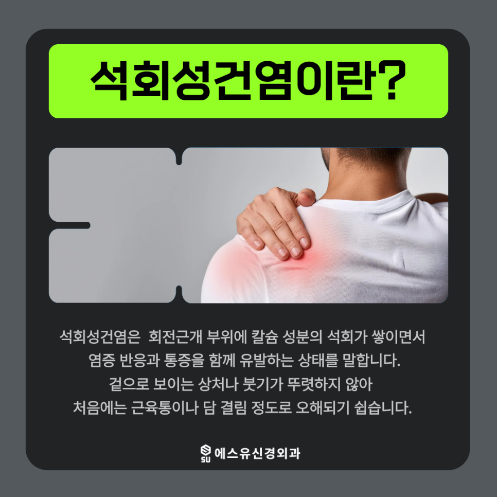 오늘은 에스유신경외과에서 양쪽어깨통증이 갑자기 나타나는 이유 그리고 석회성건염이 어떤 질환인지, 어떤 치료가 도움이 될 수 있는지 차근차근 이야기해보겠습니다.