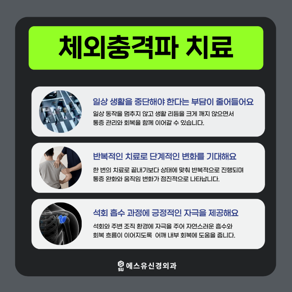 충격파가 전달되면 조직 내 미세 순환 개선과 세포 반응 활성화가 일어나면서 회복 과정이 촉진될 수 있습니다. 또한 석회 주변 조직의 자극을 완화하는 데 도움을 줄 수 있습니다.
