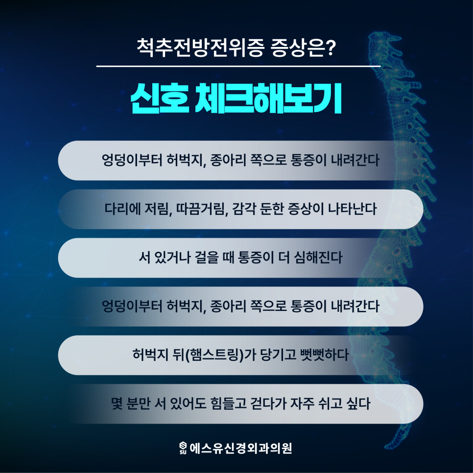 이처럼 허리 통증과 함께 다리 쪽 감각 이상이 동반되는 경우에는 척추 구조 변화가 원인이 되는 경우도 있는데요. 그중 하나가 바로 척추전방전위증입니다. 허리뼈의 배열이 틀어지면서 주변 신경에 영향을 주고, 그 결과 종아리까지 찌릿한 느낌이 이어질 수 있습니다. 오늘은 이러한 증상이 왜 나타나는지 그리고 어떤 관리가 필요한지 함께 살펴보겠습니다.
