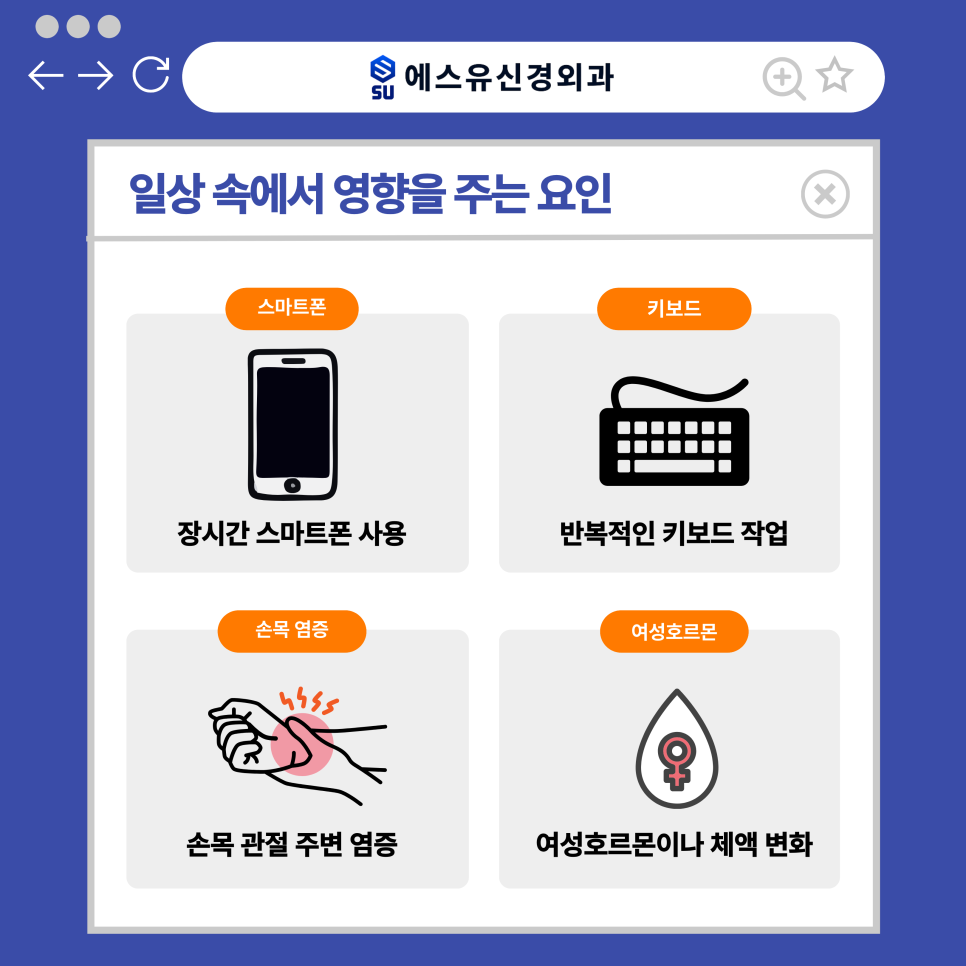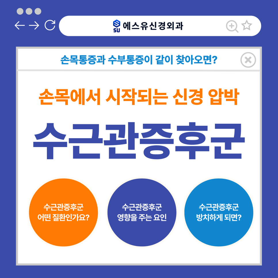 이런 변화가 계속된다면 손목통증, 수부통증의 대표적인 원인 중 하나인 수근관증후군을 한 번쯤 의심해볼 필요가 있습니다. 수원손목통증치료 에스유신경외과에서도 손목과 손 전체에 걸쳐 불편함을 호소하며 내원하는 분들이 꾸준히 증가하고 있습니다. 특히 특정 손가락이 저리거나 밤에 증상이 더 심해지는 경우라면 일시적인 문제가 아니라 신경 압박과 관련된 상태일 가능성이 있습니다.