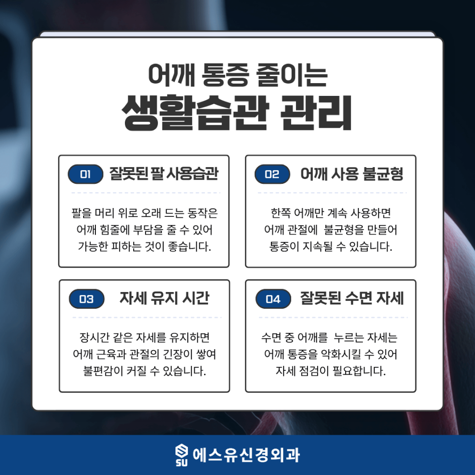 반복되는 어깨 통증의 원인을 차분히 살펴보고 현재 생활에 맞는 관리 방법을 고민해보시길 바랍니다. 지금까지 매탄동정형외과 에스유신경외과였습니다.